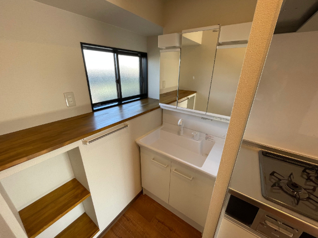 システムキッチンで3口コンロ・追い焚き・都市ガス・温水洗浄便座・南向きと嬉しい条件整っています。