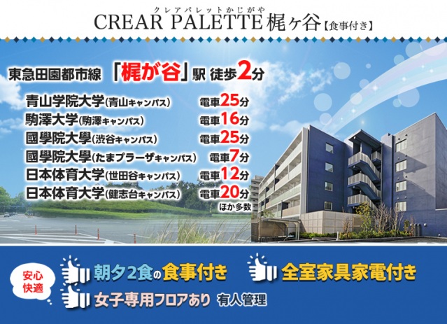 • 通勤管理/青山学院大学、國學院大學、駒澤大学に通学が便利な食事付き学生マンション!駅徒歩2分という立地に加え、渋谷駅まで電車で22分。また全室家具家電付きでお引越しも楽々です。女子専用フロアがあり、セキュリティ設備・サービスが充実、全室バス・トイレセパレート♪門限なしでプライベートも確保できます!