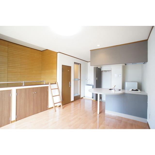 茨城大学370m。ビルトインのコンロ付。カウンタータイプのキッチンはちょっとしたテーブル代わりに。ベットスペースも完備しているのでお部屋を広くお使いいただけます。家電3点付き(冷蔵庫・洗濯機・照明)