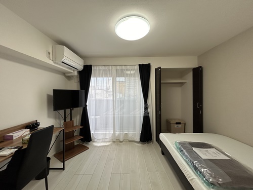 ポケットWi-Fi50/G/月無料貸出、テレビ、洗濯機(設置不可物件無し)、冷蔵庫、電子レンジ、掃除機、エアコン・照明・ベット・机・イス・カーテンなどの家具・家電付き。家具家電撤去相談(実費負担)